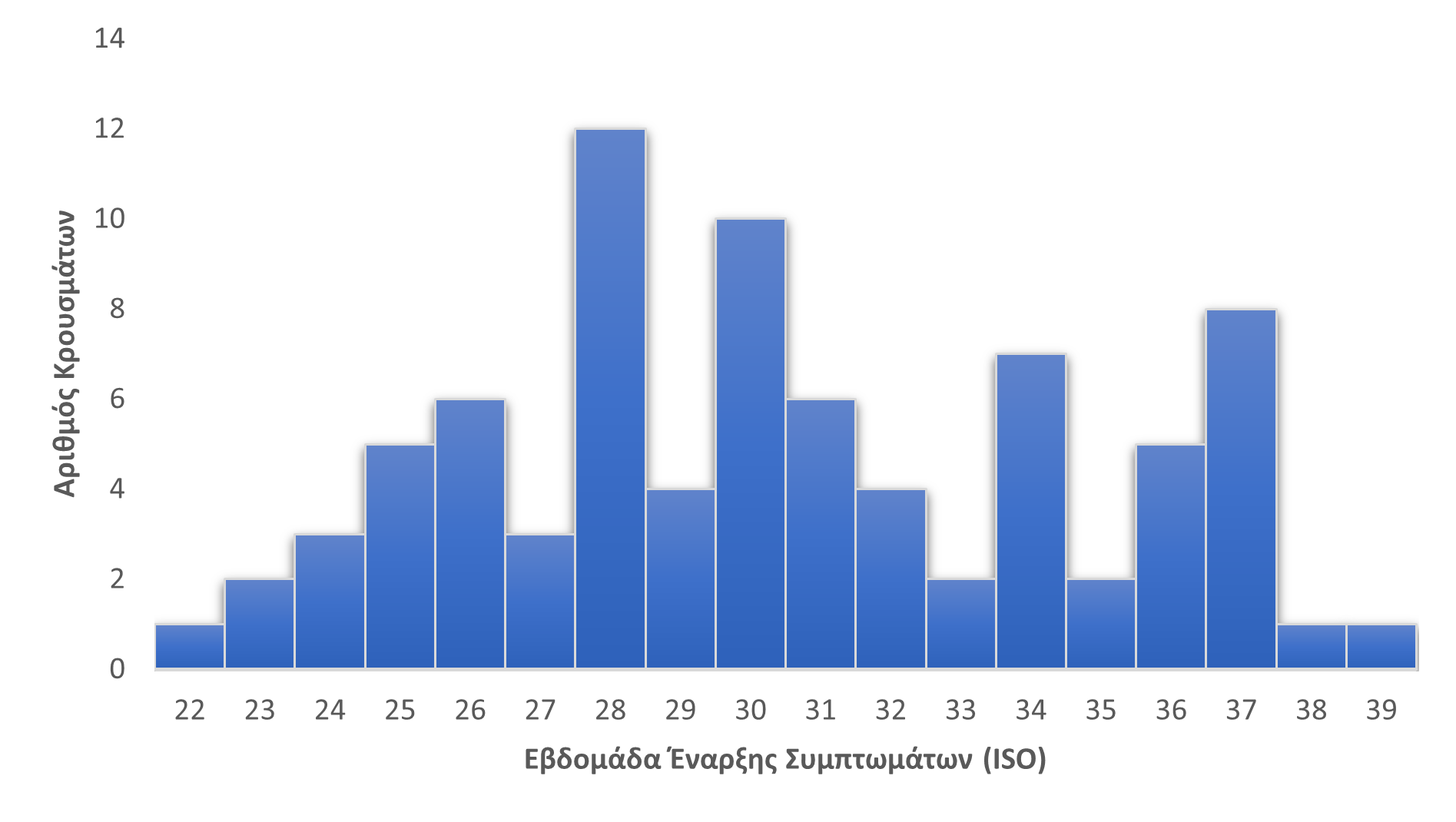 Η ευλογιά των πιθήκων είναι ιογενής λοίμωξη που αναγνωρίστηκε για πρώτη φορά το 1958. Έκτοτε, εμφανίζεται σε τροπικές περιοχές της Δυτικής και Κεντρικής Αφρικής. Μεταδίδεται μέσω της επαφής με άγρια ζώα και από άνθρωπο σε άνθρωπο με τη στενή σωματική επαφή. Τα στοιχεία που παρουσιάζονται στην παρούσα έκθεση αφορούν στα εργαστηριακά επιβεβαιωμένα κρούσματα της λοίμωξης από ιό της ευλογιάς των πιθήκων στην Ελλάδα, βάσει των δεδομένων που έχουν δηλωθεί στον ΕΟΔΥ και έχουν καταγραφεί μέχρι τις 13 Οκτωβρίου 2022. Το Μάιο του 2022 καταγράφηκε αυξημένος αριθμός κρουσμάτων ευλογιάς πιθήκων σε μη ενδημικές χώρες. Συνολικά, στην Ευρώπη, μέχρι τις 11 Οκτωβρίου 2022 καταγράφηκαν 24.973 κρούσματα της νόσου σε 45 διαφορετικές χώρες (πηγή: https://monkeypoxreport.ecdc.europa.eu/). Ο συνολικός αριθμός των εργαστηριακά επιβεβαιωμένων κρουσμάτων από την έναρξη της καταγραφής ανέρχεται σε 82 (όλοι άνδρες, διάμεση ηλικία: 37 έτη (19-61), εκ των οποίων 23 ανέφεραν ταξίδι στο εξωτερικό εντός του χρόνου επώασης της νόσου (28%). Η χρονική κατανομή των εργαστηριακά επιβεβαιωμένων κρουσμάτων ανά εβδομάδα έναρξης συμπτωμάτων (εβδομάδα κατά ISO) παρουσιάζεται στο παρακάτω Γράφημα.