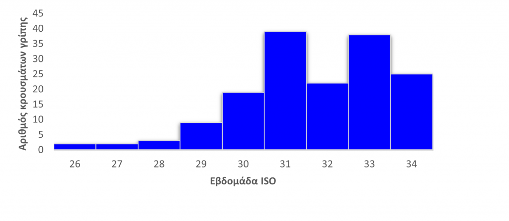 Η εργαστηριακά επιβεβαιωμένη γρίπη ανήκει στα νοσήματα που επιτηρούνται μέσω του Συστήματος Υποχρεωτικής Δήλωσης Νοσημάτων (ΣΥΔΝ) του ΕΟΔΥ. Συνολικά, από τις 7 Ιουλίου έως τις 31 Αυγούστου, δηλώθηκαν μέσω του ΣΥΔΝ 174 κρούσματα γρίπης (86 εργαστηριακά επιβεβαιωμένα με PCR και 88 με αντιγονική δοκιμασία). Εκατόν εβδομήντα δύο (172) κρούσματα ανήκαν στον τύπο Α και δύο (2) στον τύπο Β. Υποτυποποιήθηκαν 25 δείγματα τύπου Α, εκ των οποίων τα 24 ανήκαν στον υπότυπο A(Η3Ν2) και 1 στον υπότυπο A(Η1Ν1). Ο αριθμός των δηλωθέντων κρουσμάτων ήταν σχεδόν πέντε φορές υψηλότερος από τον αριθμό των κρουσμάτων που δηλώθηκαν την ίδια περίοδο το 2019 μέσω του ΣΥΔΝ (37 κρούσματα γρίπης), ενώ δεν δηλώθηκε κανένα κρούσμα γρίπης το χρονικό διάστημα 2020-2021. Από τα δηλωθέντα κρούσματα γρίπης, 160 ήταν Έλληνες (92%) και 14 αλλοδαποί (8%) από εννέα χώρες, όλες από το Βόρειο Ημισφαίριο. Η διάμεση ηλικία των κρουσμάτων ήταν 22 έτη (εύρος: 1-75 έτη), ενώ 10 κρούσματα ήταν παιδιά ηλικίας ≤12 ετών. Το 58% των κρουσμάτων ήταν άνδρες. Η κατανομή των κρουσμάτων γρίπης ανά εβδομάδα έναρξης συμπτωμάτων απεικονίζεται στο Διάγραμμα 1. Διάγραμμα 1. Εργαστηριακά επιβεβαιωμένα κρούσματα γρίπης ανά εβδομάδα έναρξης συμπτωμάτων (για τα κρούσματα που ήταν διαθέσιμη η αντίστοιχη πληροφορία), Σύστημα Υποχρεωτικής Δήλωσης Νοσημάτων, σύνολο χώρας, εβδομάδες 26/2022 - 34/2022
