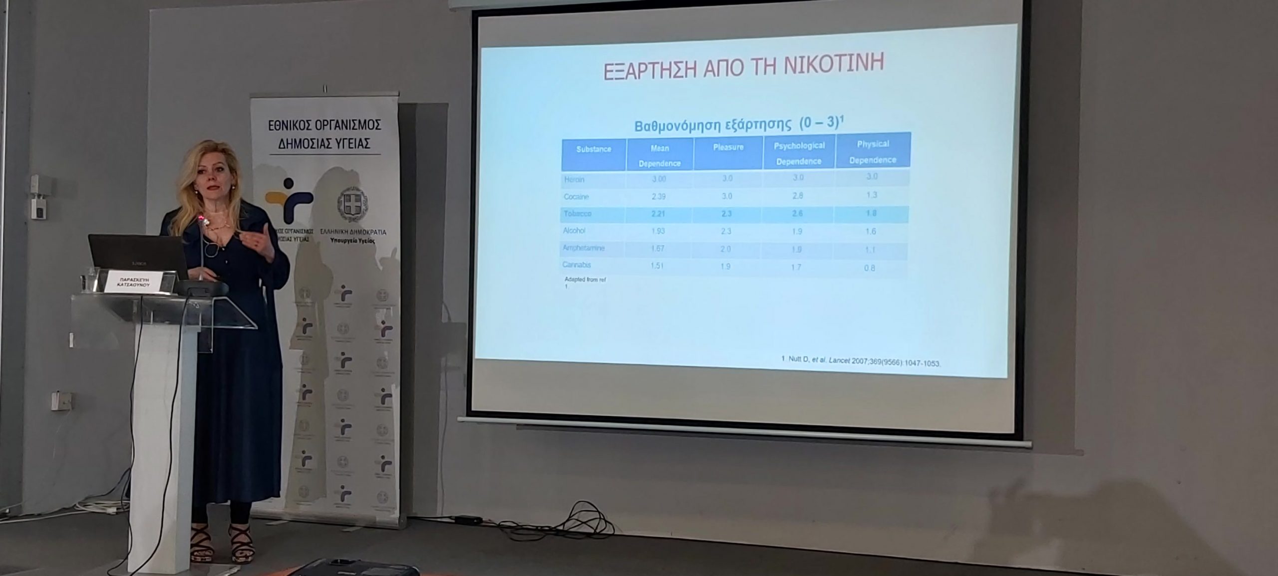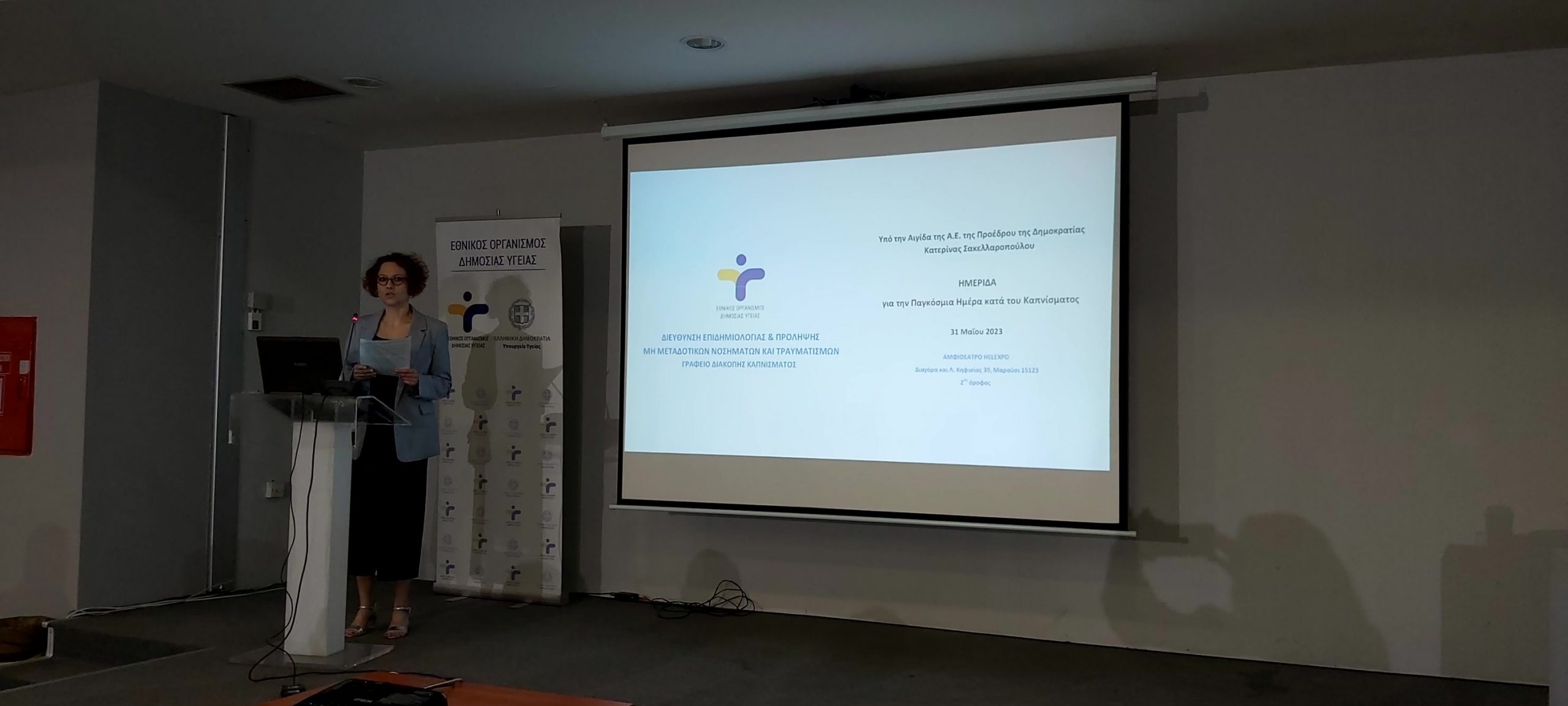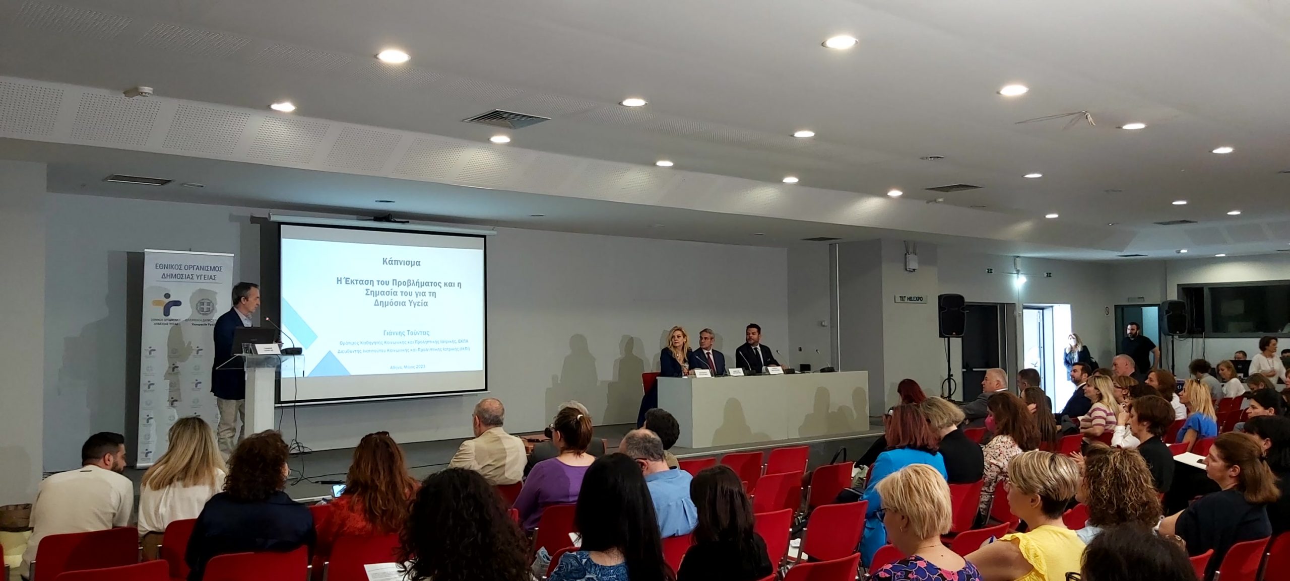 Παρουσία της ηγεσίας του Υπουργείου Υγείας, πραγματοποιήθηκε η Επιστημονική Ημερίδα για την Παγκόσμια Ημέρα Κατά του Καπνίσματος, η οποία τελούσε υπό την Αιγίδα της Α.Ε. της Προέδρου της Δημοκρατίας Κατερίνας Σακελλαροπούλου και διοργάνωσε ο Εθνικός Οργανισμός Δημόσιας Υγείας, μέσω του Γραφείου Διακοπής Καπνίσματος της Διεύθυνσης Επιδημιολογίας και Πρόληψης Μη Μεταδοτικών Νοσημάτων και Τραυματισμών. Την Ημερίδα που διεξήχθη στο αμφιθέατρο της HELEXPΟ, παρακολούθησε μεγάλος αριθμός συμμετεχόντων, δια ζώσης, όσο και διαδικτυακά. Στην ημερίδα απηύθυναν χαιρετισμό η Υπουργός Υγείας της Υπηρεσιακής Κυβέρνησης κα. Αναστασία Κοτανίδου, η αναπληρώτρια υπουργός Υγείας κα. Ασημίνα Γκάγκα, o Γενικός Γραμματέας Πρωτοβάθμιας Φροντίδας του Υπουργείου Υγείας κ. Μάριος Θεμιστοκλέους, ο Αντιπεριφερειάρχης Δ.Υ και Κοινωνικής Μέριμνας κ. Ιωάννης Κεχρής, εκπρόσωπος από τη Γενική Διεύθυνση Δημόσιας Υγείας, ο Αντιπρόεδρος του Δ.Σ. ΕΟΔΥ για τα Μεταδοτικά κ. Δημήτριος Παρασκευής και ο Αντιπρόεδρος του Δ.Σ. για τα Μη- Μεταδοτικά κ. Σπύρος Σαπουνάς. Η Υπουργός Υγείας κα. Κοτανίδου συνεχάρη τους διοργανωτές και επισήμανε στο χαιρετισμό της για την κήρυξη των Εργασιών, ότι « Το κάπνισμα προκαλεί όχι μόνο καρκίνο του πνεύμονα, αλλά ευθύνεται, επίσης, για πάρα πολλά δεινά τα οποία έχουμε στη ζωή μας και πως αντίστοιχες επιστημονικές ημερίδες πρέπει να γίνονται συχνότερα». Στη συνέχεια διακεκριμένοι ομιλητές ενημέρωσαν τους συμμετέχοντες για τις νεότερες εξελίξεις στον τομέα του καπνίσματος, ενώ στα θέματα που συζητήθηκαν δόθηκε ιδιαίτερη έμφαση τόσο στο ενεργητικό όσο και στο παθητικό κάπνισμα/άτμισμα, παγκοσμίως αλλά και στην Ελλάδα, στις υφιστάμενες και επερχόμενες νομοθετικές ρυθμίσεις για τα θερμαινόμενα προϊόντα καπνού, καθώς και στους μηχανισμούς σωματικής και ψυχολογικής εξάρτησης αλλά και τους τρόπους διαχείρισης και αντιμετώπισης της νόσου του καπνίσματος. Ιδιαίτερη μνεία έγινε στα νεότερα καπνικά προϊόντα και αποσαφηνίστηκε ότι δεν έχουν θέση στη διακοπή καπνίσματος ενώ διαχωρίστηκαν οι μύθοι και η πραγματικότητα για το κάπνισμα και τη διακοπή καπνίσματος. Επιπλέον, συζητήθηκε ο ρόλος της κοινωνίας των πολιτών, των ευρωπαϊκών προγραμμάτων σχετικών με το κάπνισμα σε επίπεδο Ε.Ε. και των ιατρείων διακοπής καπνίσματος στον αγώνα κατά του καπνίσματος.