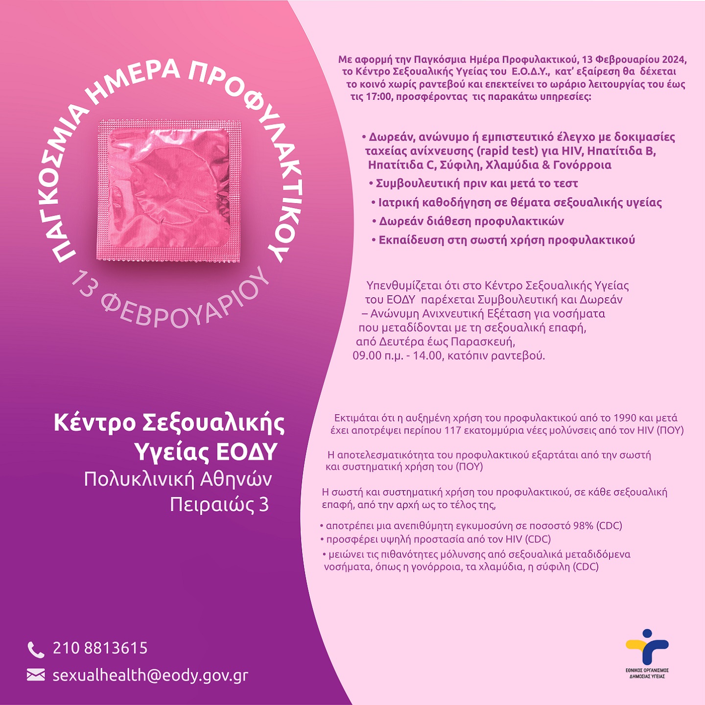 Με αφορμή την Παγκόσμια Ημέρα Προφυλακτικού, 13 Φεβρουαρίου 2024, το Κέντρο Σεξουαλικής Υγείας του Ε.Ο.Δ.Υ., κατ' εξαίρεση θα δέχεται το κοινό χωρίς ραντεβού και επεκτείνει το ωράριο λειτουργίας του έως τις 17:00, προσφέροντας τις παρακάτω υπηρεσίες:
