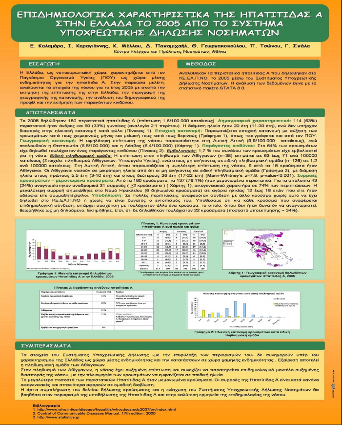 Καλαμάρα Ε, Καραγιάννης Ι, Μέλλου Κ, Παπαμιχαήλ Δ, Γεωργακοπούλου Θ, Τσώνου Π, Σπάλα Γ. «Επιδημιολογικά χαρακτηριστικά της ηπατίτιδας Α στην Ελλάδα το 2005 από το Σύστημα Υποχρεωτικής Δήλωσης Νοσημάτων». 32 Πανελλήνιο Ιατρικό Συνέδριο. 9-13 Μαΐου 2006, Αθήνα «Mellou K, Chrisostomou A, Sideroglou T, Georgakopoulou T, Kyritsi M, Hadjichristodoulou C, Tsiodras S. «Hepatitis A among refugees, asylum seekers and migrants living in hosting facilities, Greece, April to December 2016» Euro Surveill 2017;22(4)Στρατηγικές Πρόληψης & Ελέγχου