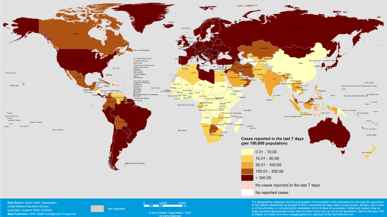 Από τις 31 Δεκεμβρίου 2019 έως τις 6 Φεβρουαρίου 2022 αναφέρθηκαν συνολικά 392.145.701 εργαστηριακά επιβεβαιωμένα κρούσματα COVID-19 και 5.724.353 θάνατοι.