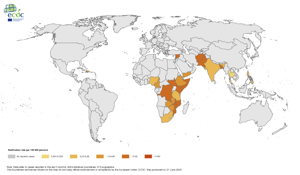 Το 2023, έως τις 11 Ιουλίου, αναφέρθηκαν έξι κρούσματα από τον ιό της πολιομυελίτιδας WPV1 στο Αφγανιστάν (5) και στο Πακιστάν (1).
