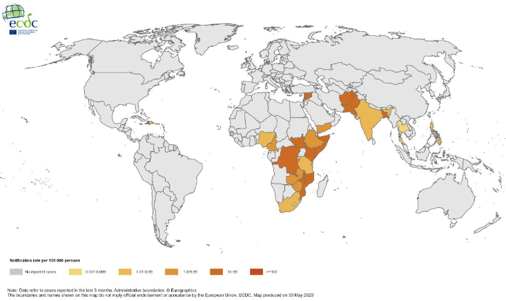 Σουδάν: Το 2023, έως τις 28 Φεβρουαρίου, αναφέρθηκαν 1.701 κρούσματα (1.012 επιβεβαιωμένα κρούσματα) και 14 θάνατοι.