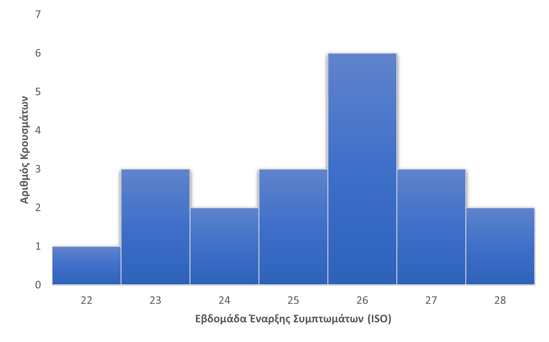 Ο συνολικός αριθμός των εργαστηριακά επιβεβαιωμένων κρουσμάτων από την έναρξη της καταγραφής ανέρχεται σε 39 (όλοι άνδρες, διάμεση ηλικία: 37 έτη (22-59), εκ των οποίων 13 ανέφεραν ταξίδι στο εξωτερικό εντός του χρόνου επώασης της νόσου (33%). Η χρονική κατανομή των εργαστηριακά επιβεβαιωμένων κρουσμάτων ανά εβδομάδα έναρξης συμπτωμάτων (εβδομάδα κατά ISO) παρουσιάζεται στο Γράφημα 1.