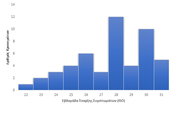 Η ευλογιά των πιθήκων είναι ιογενής λοίμωξη που αναγνωρίστηκε για πρώτη φορά το 1958. Έκτοτε, εμφανίζεται σε τροπικές περιοχές της Δυτικής και Κεντρικής Αφρικής. Μεταδίδεται μέσω της επαφής με άγρια ζώα και από άνθρωπο σε άνθρωπο με τη στενή σωματική επαφή. Το Μάιο του 2022 καταγράφηκε αυξημένος αριθμός κρουσμάτων ευλογιάς πιθήκων σε μη ενδημικές χώρες. Συνολικά, στην Ευρώπη, μέχρι τις 16 Αυγούστου 2022 καταγράφηκαν 18.960 κρούσματα της νόσου σε 43 διαφορετικές χώρες (πηγή: https://monkeypoxreport.ecdc.europa.eu/). Τα στοιχεία που παρουσιάζονται στην παρούσα έκθεση αφορούν στα εργαστηριακά επιβεβαιωμένα κρούσματα της λοίμωξης από ιό της ευλογιάς των πιθήκων στην Ελλάδα, βάσει των δεδομένων που έχουν δηλωθεί στον ΕΟΔΥ και έχουν καταγραφεί μέχρι τις 18 Αυγούστου 2022. Η Διεύθυνση Επιδημιολογικής Επιτήρησης και Παρέμβασης για Λοιμώδη Νοσήματα του ΕΟΔΥ πραγματοποιεί συστηματική διερεύνηση των διαγνωσμένων κρουσμάτων, μέσω επικοινωνίας με τους θεράποντες ιατρούς ή/και μέσω συνεντεύξεων με τους ασθενείς, ώστε να προσδιορισθούν τα χαρακτηριστικά της νόσου και οι παράγοντες κινδύνου. Ο συνολικός αριθμός των εργαστηριακά επιβεβαιωμένων κρουσμάτων από την έναρξη της καταγραφής ανέρχεται σε 50 (όλοι άνδρες, διάμεση ηλικία: 36 έτη (19-59), εκ των οποίων 16 ανέφεραν ταξίδι στο εξωτερικό εντός του χρόνου επώασης της νόσου (32%). Η χρονική κατανομή των εργαστηριακά επιβεβαιωμένων κρουσμάτων ανά εβδομάδα έναρξης συμπτωμάτων (εβδομάδα κατά ISO) παρουσιάζεται στο Γράφημα 1.