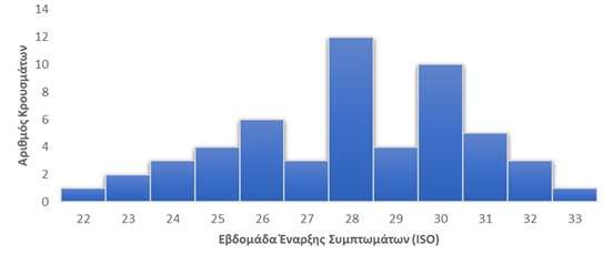 Η ευλογιά των πιθήκων είναι ιογενής λοίμωξη που αναγνωρίστηκε για πρώτη φορά το 1958. Έκτοτε, εμφανίζεται σε τροπικές περιοχές της Δυτικής και Κεντρικής Αφρικής. Μεταδίδεται μέσω της επαφής με άγρια ζώα και από άνθρωπο σε άνθρωπο με τη στενή σωματική επαφή. Το Μάιο του 2022 καταγράφηκε αυξημένος αριθμός κρουσμάτων ευλογιάς πιθήκων σε μη ενδημικές χώρες. Συνολικά, στην Ευρώπη, μέχρι τις 23 Αυγούστου 2022 καταγράφηκαν 21.098 κρούσματα της νόσου σε 43 διαφορετικές χώρες (πηγή: https://monkeypoxreport.ecdc.europa.eu/). Τα στοιχεία που παρουσιάζονται στην παρούσα έκθεση αφορούν στα εργαστηριακά επιβεβαιωμένα κρούσματα της λοίμωξης από ιό της ευλογιάς των πιθήκων στην Ελλάδα, βάσει των δεδομένων που έχουν δηλωθεί στον ΕΟΔΥ και έχουν καταγραφεί μέχρι τις 25 Αυγούστου 2022. Ο συνολικός αριθμός των εργαστηριακά επιβεβαιωμένων κρουσμάτων από την έναρξη της καταγραφής ανέρχεται σε 54 (όλοι άνδρες, διάμεση ηλικία: 36 έτη (19-59), εκ των οποίων 18 ανέφεραν ταξίδι στο εξωτερικό εντός του χρόνου επώασης της νόσου (33%). Η χρονική κατανομή των εργαστηριακά επιβεβαιωμένων κρουσμάτων ανά εβδομάδα έναρξης συμπτωμάτων (εβδομάδα κατά ISO) παρουσιάζεται στο παρακάτω Γράφημα.