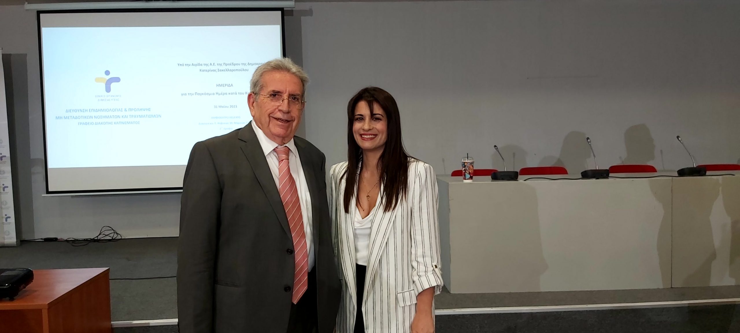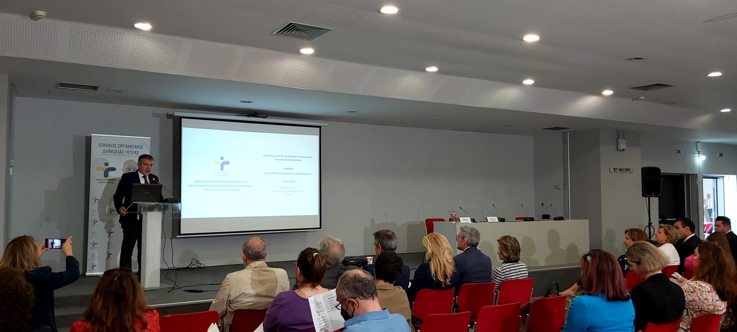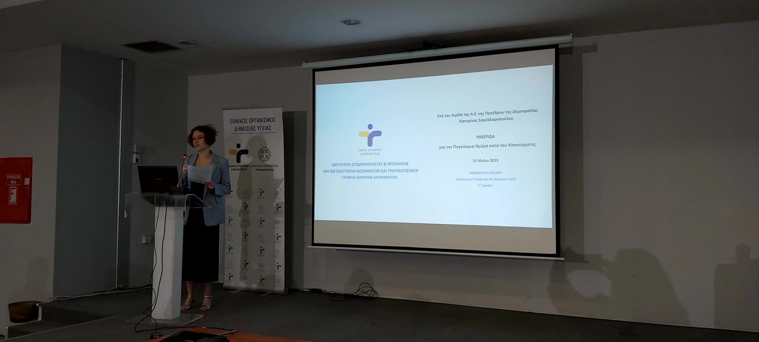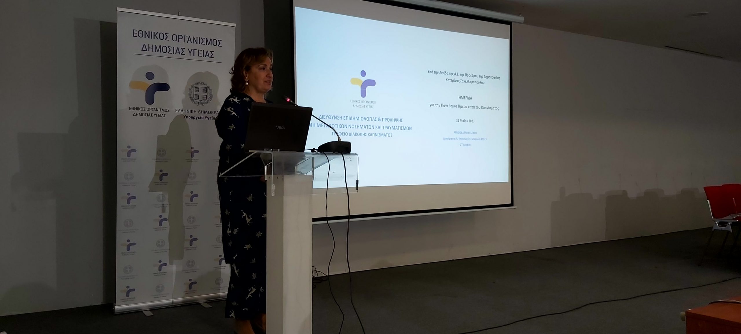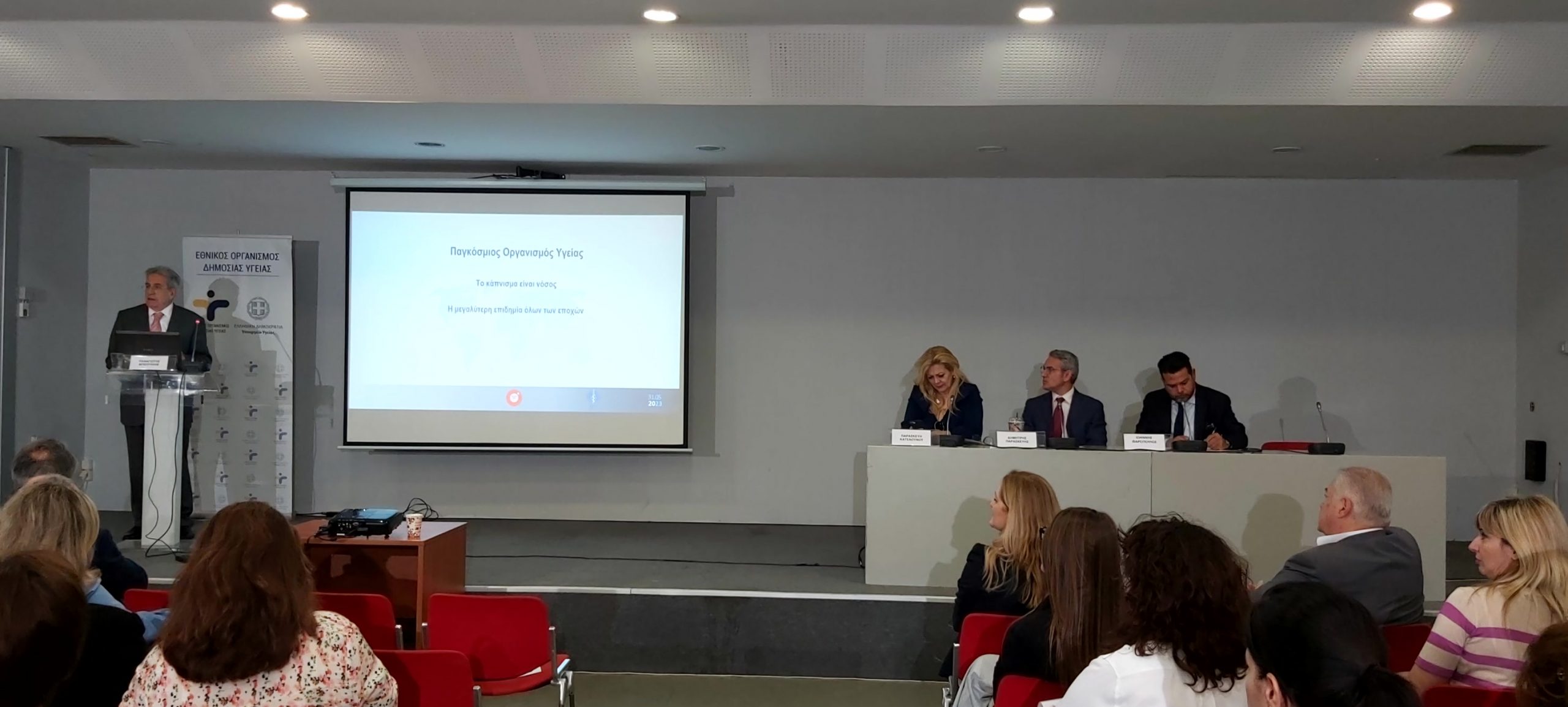 Παρουσία της ηγεσίας του Υπουργείου Υγείας, πραγματοποιήθηκε η Επιστημονική Ημερίδα για την Παγκόσμια Ημέρα Κατά του Καπνίσματος, η οποία τελούσε υπό την Αιγίδα της Α.Ε. της Προέδρου της Δημοκρατίας Κατερίνας Σακελλαροπούλου και διοργάνωσε ο Εθνικός Οργανισμός Δημόσιας Υγείας, μέσω του Γραφείου Διακοπής Καπνίσματος της Διεύθυνσης Επιδημιολογίας και Πρόληψης Μη Μεταδοτικών Νοσημάτων και Τραυματισμών. Την Ημερίδα που διεξήχθη στο αμφιθέατρο της HELEXPΟ, παρακολούθησε μεγάλος αριθμός συμμετεχόντων, δια ζώσης, όσο και διαδικτυακά. Στην ημερίδα απηύθυναν χαιρετισμό η Υπουργός Υγείας της Υπηρεσιακής Κυβέρνησης κα. Αναστασία Κοτανίδου, η αναπληρώτρια υπουργός Υγείας κα. Ασημίνα Γκάγκα, o Γενικός Γραμματέας Πρωτοβάθμιας Φροντίδας του Υπουργείου Υγείας κ. Μάριος Θεμιστοκλέους, ο Αντιπεριφερειάρχης Δ.Υ και Κοινωνικής Μέριμνας κ. Ιωάννης Κεχρής, εκπρόσωπος από τη Γενική Διεύθυνση Δημόσιας Υγείας, ο Αντιπρόεδρος του Δ.Σ. ΕΟΔΥ για τα Μεταδοτικά κ. Δημήτριος Παρασκευής και ο Αντιπρόεδρος του Δ.Σ. για τα Μη- Μεταδοτικά κ. Σπύρος Σαπουνάς. Η Υπουργός Υγείας κα. Κοτανίδου συνεχάρη τους διοργανωτές και επισήμανε στο χαιρετισμό της για την κήρυξη των Εργασιών, ότι « Το κάπνισμα προκαλεί όχι μόνο καρκίνο του πνεύμονα, αλλά ευθύνεται, επίσης, για πάρα πολλά δεινά τα οποία έχουμε στη ζωή μας και πως αντίστοιχες επιστημονικές ημερίδες πρέπει να γίνονται συχνότερα». Στη συνέχεια διακεκριμένοι ομιλητές ενημέρωσαν τους συμμετέχοντες για τις νεότερες εξελίξεις στον τομέα του καπνίσματος, ενώ στα θέματα που συζητήθηκαν δόθηκε ιδιαίτερη έμφαση τόσο στο ενεργητικό όσο και στο παθητικό κάπνισμα/άτμισμα, παγκοσμίως αλλά και στην Ελλάδα, στις υφιστάμενες και επερχόμενες νομοθετικές ρυθμίσεις για τα θερμαινόμενα προϊόντα καπνού, καθώς και στους μηχανισμούς σωματικής και ψυχολογικής εξάρτησης αλλά και τους τρόπους διαχείρισης και αντιμετώπισης της νόσου του καπνίσματος. Ιδιαίτερη μνεία έγινε στα νεότερα καπνικά προϊόντα και αποσαφηνίστηκε ότι δεν έχουν θέση στη διακοπή καπνίσματος ενώ διαχωρίστηκαν οι μύθοι και η πραγματικότητα για το κάπνισμα και τη διακοπή καπνίσματος. Επιπλέον, συζητήθηκε ο ρόλος της κοινωνίας των πολιτών, των ευρωπαϊκών προγραμμάτων σχετικών με το κάπνισμα σε επίπεδο Ε.Ε. και των ιατρείων διακοπής καπνίσματος στον αγώνα κατά του καπνίσματος.