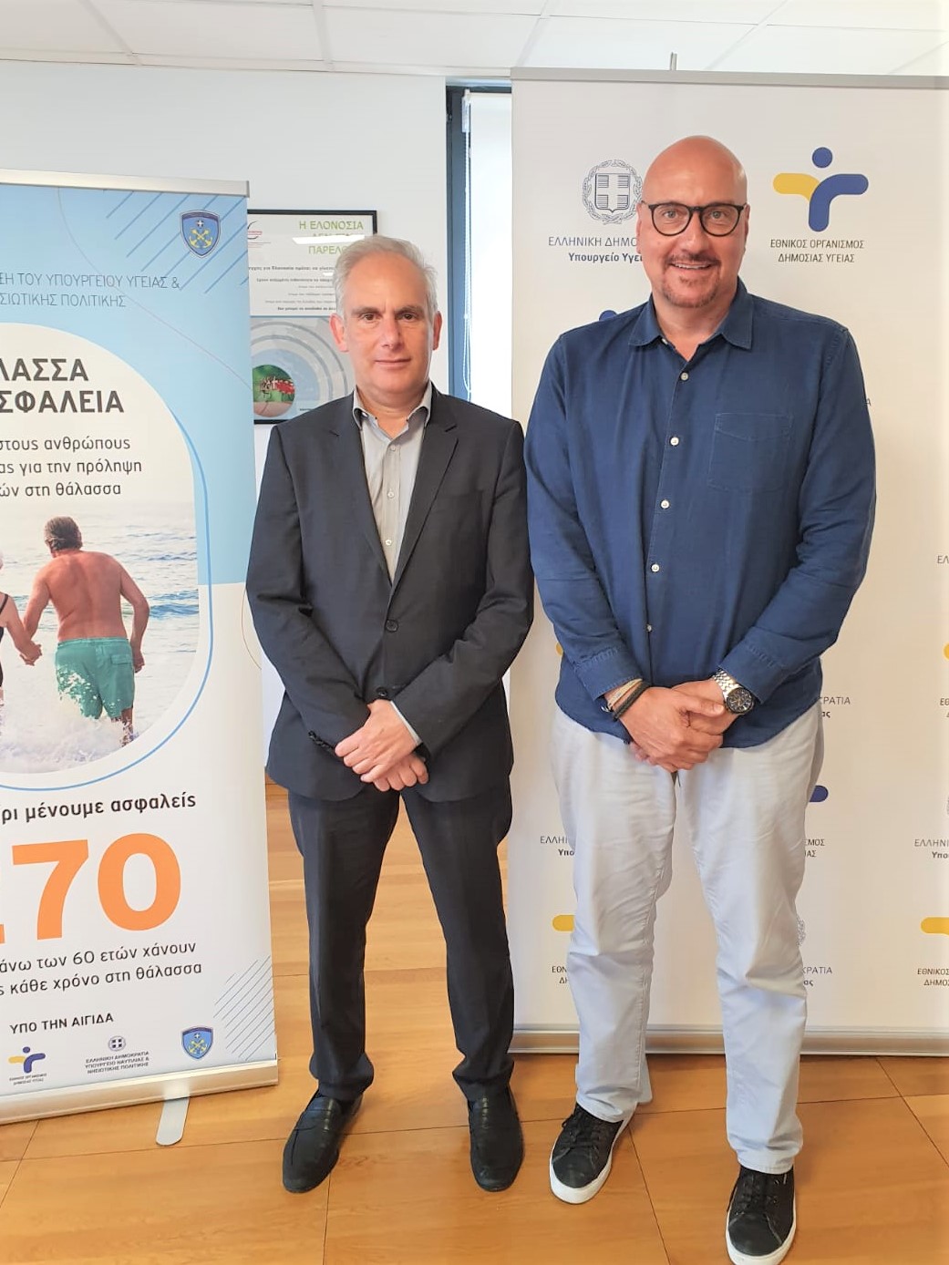 Μνημόνιο Συνεργασίας υπέγραψαν σήμερα, Πέμπτη 22 Ιουνίου 2023, στα γραφεία του Εθνικού Οργανισμού Δημόσιας Υγείας, ο Πρόεδρος του ΔΣ του ΕΟΔΥ, Καθηγητής Θεοκλής Ζαούτης και ο Πρόεδρος και Ιδρυτής της SAFE WATER SPORTS (Μη κερδοσκοπικό Σωματείο) «Ελληνική Εταιρεία Προώθησης της Ασφάλειας των αθλημάτων και μέσων αναψυχής στη θάλασσα και στο νερό» κ. Παναγιώτης Πασχαλάκης.