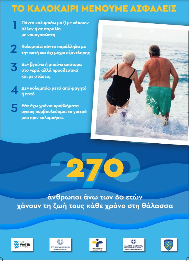 O Εθνικός Οργανισμός Δημόσιας Υγείας (ΕΟΔΥ) πραγματοποίησε, στις 17 Ιουνίου 2022, τηλεδιάσκεψη με θέμα «Το καλοκαίρι μένουμε ασφαλείς» - Ενημερωτική καμπάνια για την ασφάλεια των ατόμων 3ης ηλικίας στη θάλασσα» με τη συμμετοχή περισσοτέρων από 100 εκπρόσωπων της Τοπικής Αυτοδιοίκησης, φορέων του Υπουργείου Υγείας, του Λιμενικού Σώματος, της Διεύθυνσης Λιμενικής Αστυνομίας και κοινωνικών φορέων. Χαιρετισμούς απηύθυναν ο Πρόεδρος του Εθνικού Οργανισμού Δημόσιας Υγείας Καθηγητής Θεοκλής Ζαούτης, ο Πρόεδρος του Πανελληνίου Συλλόγου Φυσικοθεραπευτών κ. Πέτρος Λυμπερίδης, η Διοικήτρια της 7ης Υγειονομικής Περιφέρειας Κρήτης κα Ελένη Μπορμπουδάκη, ο ταμίας του Διοικητικού Συμβουλίου του Συνδέσμου Κοινωνικών Λειτουργών Ελλάδος κ. Περικλής Τζιάρας, και ο Πρόεδρος της Ελληνικής Γεροντολογικής και Γηριατρικής Εταιρείας Καθηγητής Ιωάννης Καραϊτιανός. Ο κ. Ζαούτης αναφερόμενος στο κύριο θέμα της τηλεδιάσκεψης, την παρουσίαση της φετινής καμπάνιας με επίκεντρο τους ηλικιωμένους συμπολίτες μας, που αποτελούν διαχρονικά στην Ελλάδα τα πιο συχνά θύματα πνιγμών, υπογράμμισε ότι «Θεωρούμε εξαιρετικά σημαντική την ενημέρωση των επαγγελματιών υγείας, που προσφέρουν υπηρεσίες σε χώρους Παροχής Υπηρεσιών Υγείας και στα ΚΑΠΗ, για τις βασικές προληπτικές οδηγίες, που πρέπει να τηρούνται έτσι ώστε όλοι να απολαμβάνουν τη θάλασσα με ασφάλεια». «Σκοπός της σημερινής μας τηλεδιάσκεψης είναι η αποτροπή των ατυχημάτων και των πνιγμών στις θάλασσες, η ενίσχυση της ασφάλειας με τη συνεργασία του ΕΟΔΥ, της SafeSportsWater και όλων των φορέων, που βρίσκονται αυτή τη στιγμή μαζί μας» ανέφερε καταλήγοντας ο Πρόεδρος του ΕΟΔΥ. Ακολούθησε η παρουσίαση της φετινής καμπάνιας από τον Πρόεδρο του μη κερδοσκοπικού Οργανισμού «SafeWaterSports» κ. Παναγιώτη Πασχαλάκη και οι ομιλίες του Διευθυντή της Λιμενικής Αστυνομίας, Αρχιπλοιάρχου, κ. Χαράλαμπου Μαρουλάκη, εκπρόσωπο του Λιμενικού Σώματος Ελληνικής Ακτοφυλακής (ΛΣ.ΕΛ.ΑΚΤ.) και του Προέδρου Θεσμών και Διαφάνειας της Κεντρικής Ένωσης Δήμων Ελλάδας (ΚΕΔΕ)-Δημάρχου Βάρης Βούλας Βουλιαγμένης κ. Γρηγόρη Κωνσταντέλλου. Κατά τη διάρκεια της τηλεδιάσκεψης στην οποία από πλευράς ΕΟΔΥ συμμετείχαν ο Αντιπρόεδρος του ΕΟΔΥ Καθηγητής Δημήτρης Παρασκευής, η Προϊσταμένη της Διεύθυνσης Επιδημιολογίας και Πρόληψης Μη Μεταδοτικών Νοσημάτων και Τραυματισμών κα Αγγελική Λάμπρου και ο Προϊστάμενος του Τμήματος Επιδημιολογίας και Πρόληψης Τραυματισμών κ. Ελευθέριος Μπουρνουσούζης, συζητήθηκαν καίρια θέματα που σχετίζονται με την ανάπτυξη κοινών δράσεων για τη μείωση των πνιγμών και των ατυχημάτων στη θάλασσα, ενώ συμφωνήθηκε η αναγκαιότητα συνεργασίας όλων των αρμόδιων φορέων σε μια σειρά πρωτοβουλιών για την ενίσχυση της ασφάλειας στη θάλασσα και τη μείωση των πνιγμών καθώς και για λοιπές δράσεις πρόληψης που αφορούν τον πληθυσμό που εξυπηρετούν τα ΚΑΠΗ. Ο ΕΟΔΥ, θέτοντας πάντα ως προτεραιότητα τον άνθρωπο υποστηρίζει ενεργά και ενισχύει τις καμπάνιες ενημέρωσης και ευαισθητοποίησης σε συνεργασία με όλους τους αρμόδιους φορείς σχετικά με την πρόληψη των ατυχημάτων στη θάλασσα. Αυτό το καλοκαίρι εκείνο που προέχει είναι η ασφάλεια όλων μας.