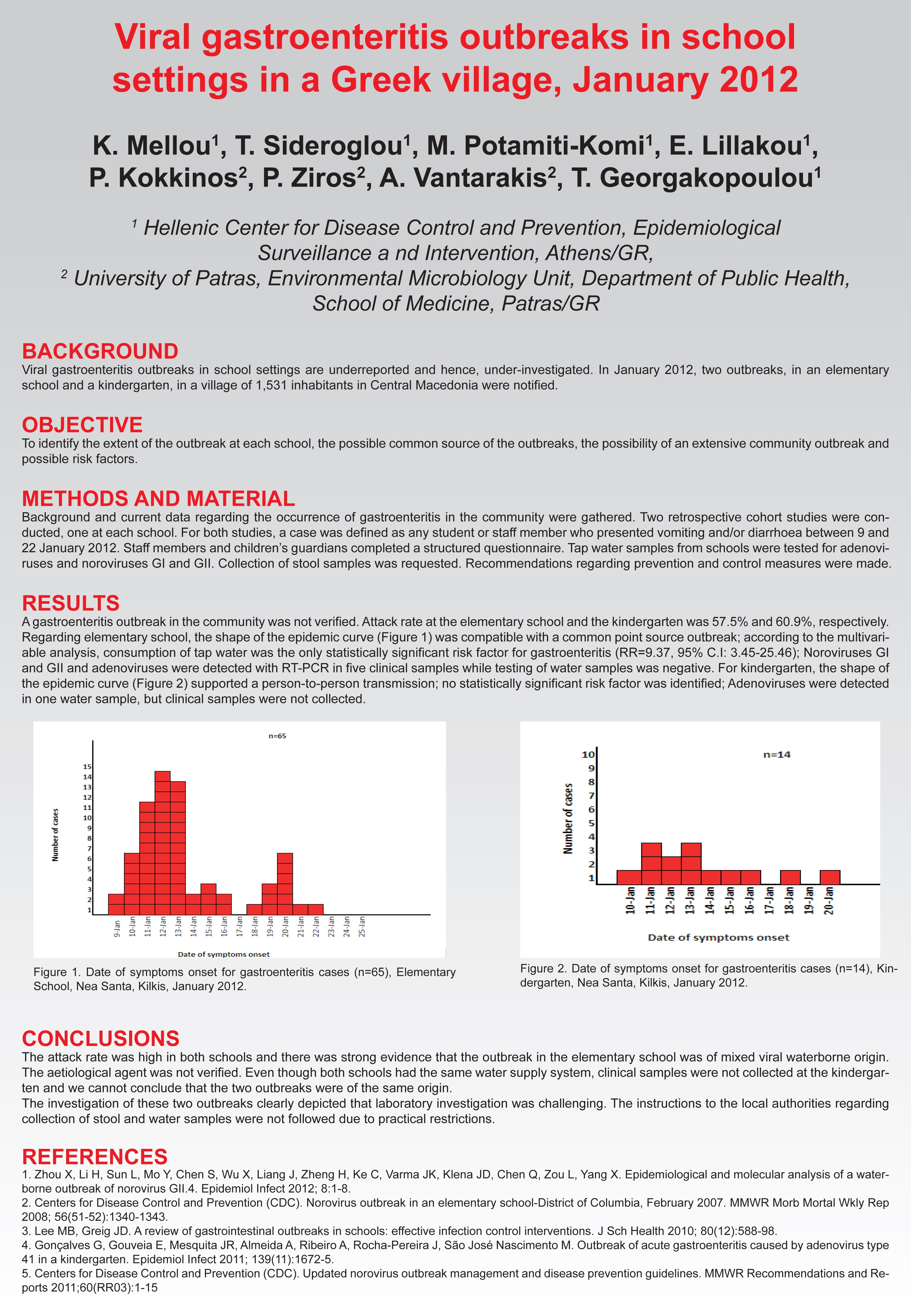 K. Mellou, A. Katsioulis, M. Potamiti Komi, S. Pournaras,M. Kyritsi, A. Katsiaflaka, A. Kallimani, P. Kokkinos, E. Petinaki, T. Sideroglou, T. Georgakopoulou, A. Vantarakis, C. Hadjichristodoulou. “A large waterborne gastroenteritis outbreak in central Greece, March 2012. Challenges in the investigation and management.” Mellou K, Sideroglou T, Potamiti-Komi M, Kokkinos P, Ziros P, Georgakopoulou T, Vantarakis A. “Epidemiological investigation of two parallel gastroenteritis outbreaks in school settings.” BMC Public Health 2013, 13:241 Available at: K Mellou, T Sideroglou, M Potamiti-Komi, E. Lillakou, P Kokkinos, P Ziros, T Georgakopoulou, A Vantarakis. Viral gastroenteritis outbreaks in school settings in a Greek village, January 2012. International Meeting on Emerging Diseases and Surveillance (IMED), Vienna, 15 - 18 February 2013Χρήσιμες Πληροφορίες