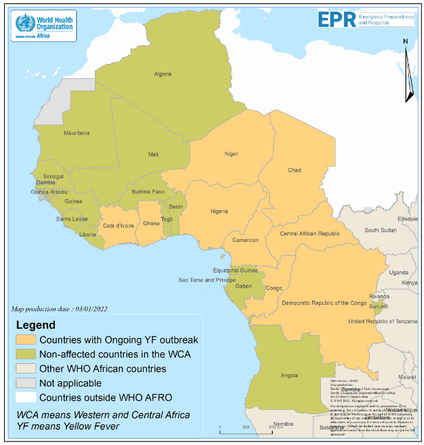 Χώρες με επιδημίες κίτρινου πυρετού σε εξέλιξη στη Δυτική και Κεντρική Αφρική, 2021