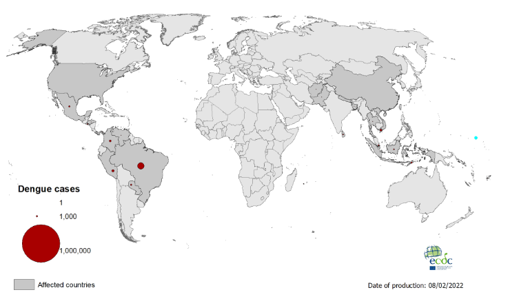 Το 2022, έως τις 7 Φεβρουαρίου, αναφέρθηκαν 40.154 κρούσματα δάγκειου πυρετού (7.873 επιβεβαιωμένα κρούσματα, 9 θάνατοι). Ο μεγαλύτερος αριθμός κρουσμάτων εντοπίζεται στη Βραζιλία (29.886), στο Περού (4.247), στην Κολομβία (3.182), στο Μεξικό (1.065) και στην Παραγουάη (967).