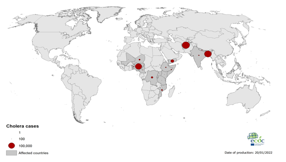 Γεωγραφική κατανομή κρουσμάτων χολέρας, έως τον Δεκέμβριο 2021