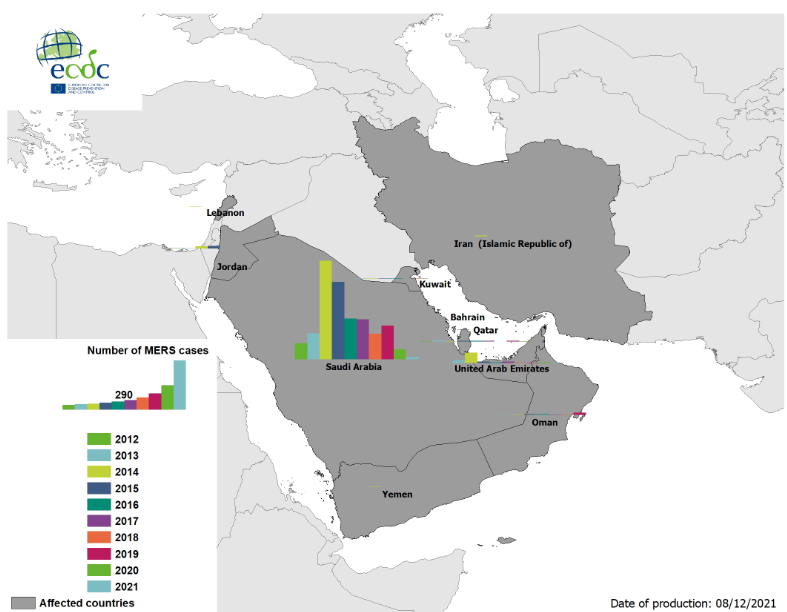 Από τον Απρίλιο 2012 έως τις 6 Δεκεμβρίου 2021, αναφέρθηκαν παγκοσμίως 2.595 εργαστηριακά επιβεβαιωμένα κρούσματα με λοίμωξη από MERS-CoV, και 941 θάνατοι. Από την 1η Ιανουαρίου 2021 έως τις 6 Δεκεμβρίου 2021 ανακοινώθηκαν 14 κρούσματα MERS-CoV στη Σαουδική Αραβία (13) και στα Ηνωμένα Αραβικά Εμιράτα (1) και 5 θάνατοι.