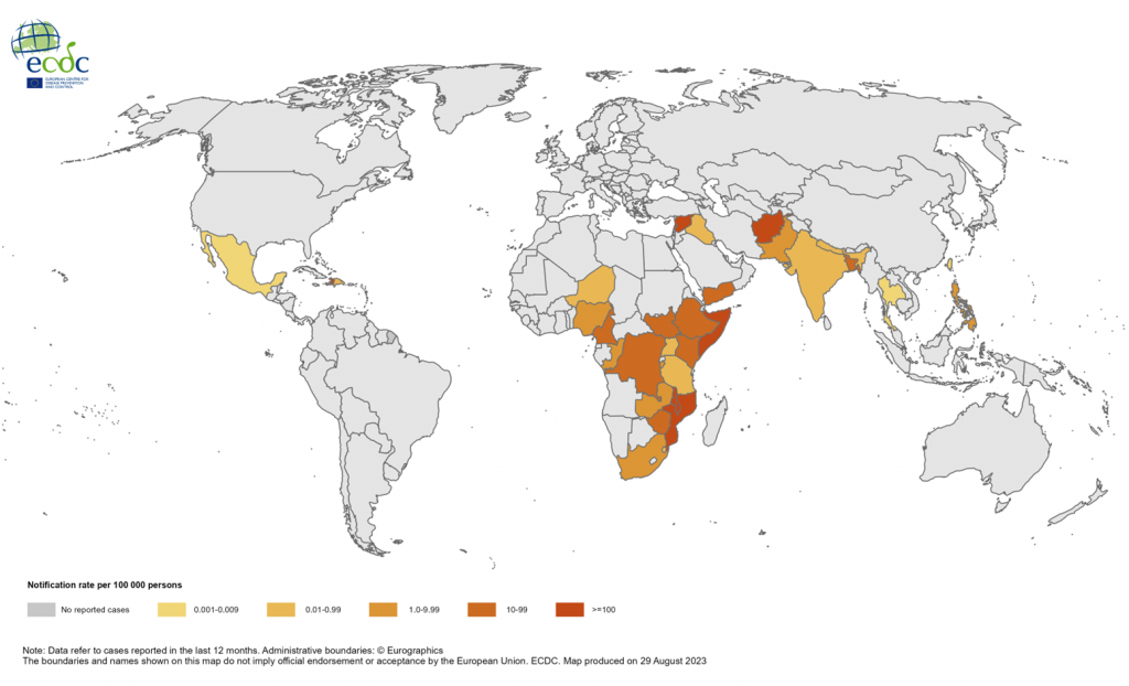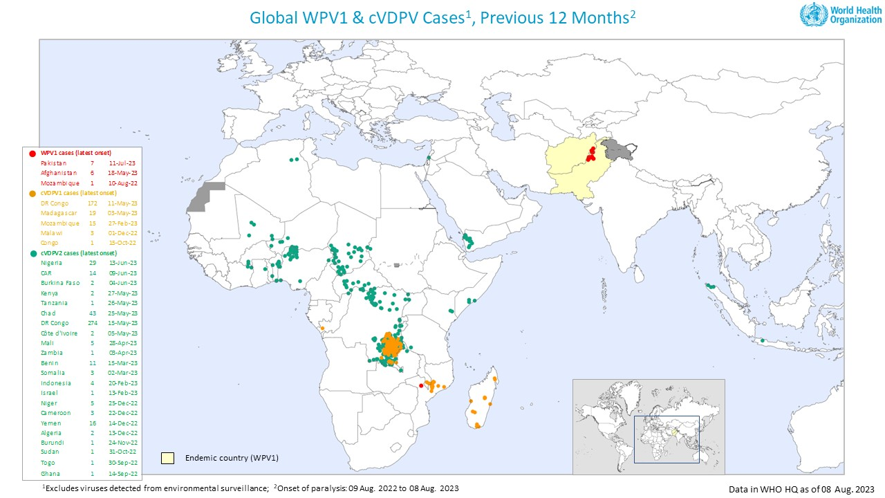 Το 2023, έως τις 29 Αυγούστου, αναφέρθηκαν 7 κρούσματα από τον ιό της πολιομυελίτιδας WPV1 στο Αφγανιστάν (5) και στο Πακιστάν (2).