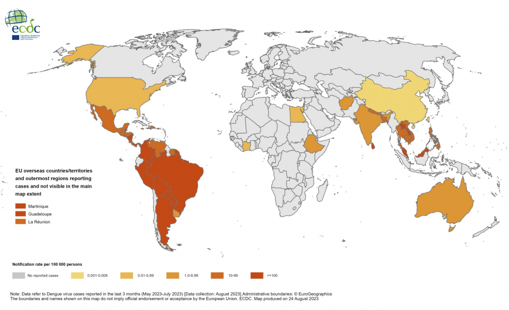 Γεωγραφική κατανομή κρουσμάτων Δάγκειου πυρετού, Μάιος – Ιούλιος 2023