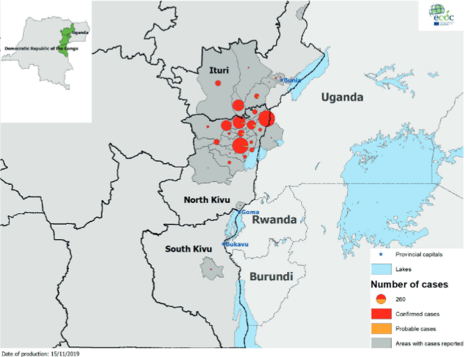 Από τον Αύγουστο του 2018 είναι σε εξέλιξη επιδημία αιμορραγικού πυρετού Ebola (EVD) στη Λαϊκή Δημοκρατία του Κονγκό. Έως τις 13 Νοεμβρίου 2019 ανακοινώθηκαν 3292 κρούσματα (3174 επιβεβαιωμένα, 118 πιθανά κρούσματα), συμπεριλαμβανομένων 2193 θανάτων. Τα κρούσματα εντοπίζονται στις επαρχίες South Kivu, North Kivu και Ituri. Τις τελευταίες 21 ημέρες ο μεγαλύτερος αριθμός κρουσμάτων αναφέρθηκε στις περιοχές Mabalako, Mandima και Beni.