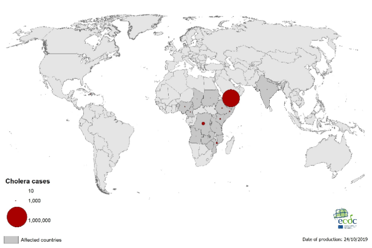 Υεμένη: Από την έναρξη της επιδημίας τον Οκτώβριο του 2016 έως τις 19 Οκτωβρίου 2019 αναφέρθηκαν 2135699 ύποπτα κρούσματα χολέρας, συμπεριλαμβανομένων 3719 θανάτων. Τα περισσότερα κρούσματα εντοπίζονται στις επαρχίες Amanat Al Asima, Al Hudaydah, Hajjah, Amran και Dhamar.