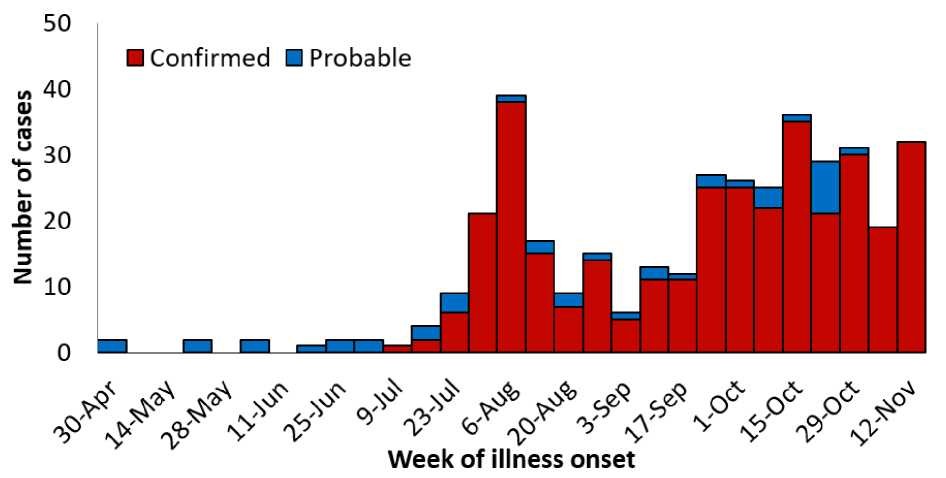 Επιβεβαιωμένες και πιθανές περιπτώσεις νόσου του ιού Ebola κατά την έναρξη της ασθένειας την εβδομάδα, δεδομένα από τις 20 Νοεμβρίου 2018