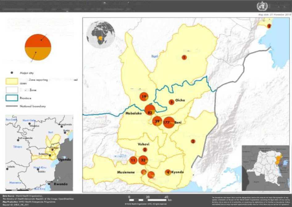 Η επιδημία έως και την 20 Νοεμβρίου εντοπίζεται στις περιοχές Beni, Butembo, Oicha, Mabalako και Musienene στην επαρχία του Βόρειου Κίβου και στην Mandimima στην επαρχία Ιτούρι. Έχουν αναφερθεί συνολικά 386 περιπτώσεις, συμπεριλαμβανομένων 219 θανάτων. Από τις 386 περιπτώσεις, 339 έχουν επιβεβαιωθεί εργαστηριακά και 47 παραμένουν πιθανές. Από τους 219 θανάτους, 172 εμφανίστηκαν σε επιβεβαιωμένες περιπτώσεις. Έχουν επηρεαστεί οκτώ εργαζόμενοι στον τομέα της υγείας (7 επιβεβαιωμένοι, 1 πιθανός), εκ των οποίων ένας έχει πεθάνει.