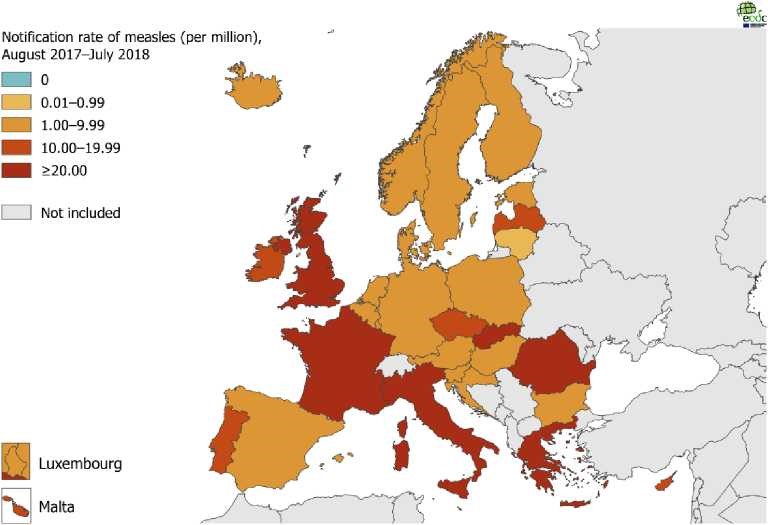 Από την 1η Ιανουαρίου 2017 έως και τις 31 Δεκεμβρίου 2017 αναφέρθηκαν 14600 κρούσματα, συμπεριλαμβανομένων 37 θανάτων, σε 30 χώρες της Ευρώπης, όπως: Αγγλία, Αυστρία, Βέλγιο, Βουλγαρία, Γαλλία, Γερμανία, Δανία, Ελβετία, Ελλάδα, Ισλανδία, Ισπανία, Ιταλία, Κροατία, Ουγγαρία, Πολωνία, Πορτογαλία, Σλοβακία, Σουηδία, και Τσεχία. Ο μεγαλύτερος αριθμός κρουσμάτων αναφέρθηκε στις χώρες: Ρουμανία (5608 κρούσματα, 26 θάνατοι), Ιταλία (5098 κρούσματα, 4 θάνατοι), Ελλάδα (967 κρούσματα, 2 θάνατοι), Γερμανία (929 κρούσματα, 1 θάνατος) και Γαλλία (518 κρούσματα, 1 θάνατος).