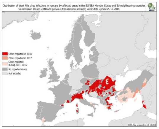 Η λοίμωξη από τον ιό του Δυτικού Νείλου (West Nile virus) είναι νόσημα που μεταδίδεται κυρίως από τσίμπημα μολυσμένου κουνουπιού και προσβάλλει ζώα (π.χ. πτηνά, άλογα) και τον άνθρωπο. Αύξηση των κρουσμάτων παρατηρείται συνήθως από τον Ιούνιο μέχρι τον Νοέμβριο. Έως τις 25 Οκτωβρίου αναφέρθηκαν (1460) κρούσματα σε αρκετά κράτη μέλη της ΕΕ και σε γειτονικές χώρες (Ιταλία (550) (44 θάνατοι), Ελλάδα (307) (42 θάνατοι), Ουγγαρία (212), Κροατία (53), Γαλλία (24), Βουλγαρία 14 και Ρουμανία (276) (42 θάνατοι).