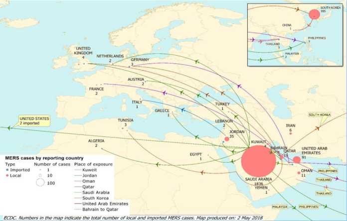Από τον Απρίλιο 2012 έως τις 5 Μαΐου 2018, αναφέρθηκαν 2224 εργαστηριακά επιβεβαιωμένα κρούσματα με λοίμωξη από MERS-CoV, συμπεριλαμβανομένων 834 θανάτων, στις χώρες: Σαουδική Αραβία, Ηνωμένα Αραβικά Εμιράτα, Κατάρ, Ιορδανία, Ομάν, Κουβέιτ, Αίγυπτος, Υεμένη, Λίβανος, Ιράν, Τουρκία, Αυστρία, Ηνωμένο Βασίλειο, Γερμανία, Γαλλία, Ιταλία, Ελλάδα, Ολλανδία, Τυνησία, Αλγερία, Μαλαισία, Φιλιππίνες, Νότια Κορέα, Κίνα, και ΗΠΑ. Σύμφωνα με τον ΠΟΥ δεν υπάρχουν συστάσεις για έλεγχο στις πύλες εισόδου ή περιορισμοί σε σχέση με το εμπόριο ή τα ταξίδια.