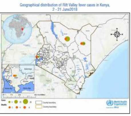 Ο πυρετός της ρηξιγενούς κοιλάδας 'Rift RVF' είναι μια ιογενής νόσος. Μεταδίδεται κυρίως από την επαφή με μολυσμένο αίμα ζώου, με την εισπνοή αέρα κοντά σε μολυσμένο ζώο που σφαγιάζεται, με την πόση μη επεξεργασμένου γάλακτος από μολυσμένο ζώο, ή μέσω τσιμπήματος μολυσμένου κουνουπιού. Ζώα όπως οι αγελάδες, τα πρόβατα, οι κατσίκες και οι καμήλες είναι πιθανόν να μολυνθούν. Σε αυτά τα ζώα μεταδίδεται κατά κύριο λόγο από τα κουνούπια. Τα συμπτώματα μπορεί να είναι ήπια, πυρετός, μυϊκοί πόνοι και κεφαλαλγία και διαρκούν έως και μία εβδομάδα ή και σοβαρά όπως απώλεια όρασης 3 βδομάδες μετά τη μόλυνση, μολύνσεις του εγκεφάλου και αιμορραγία. Όσοι παρουσιάσουν αιμορραγία εμφανίζουν αυξημένες πιθανότητες θανάτου. Η επιδημία πλήττει σήμερα τους ανθρώπους και τα ζώα στην Κένυα και στην Ουγκάντα. Από τις 11 Αυγούστου 2018 έχουν αναφερθεί στην Κένυα συνολικά 95 ύποπτα κρούσματα κυρίως σε κτηνοτρόφους, συμπεριλαμβανομένων 11 θανάτων, ενώ στην Ουγκάντα συνολικά 23 ύποπτα κρούσματα συμπεριλαμβανομένων 8 θανάτων.