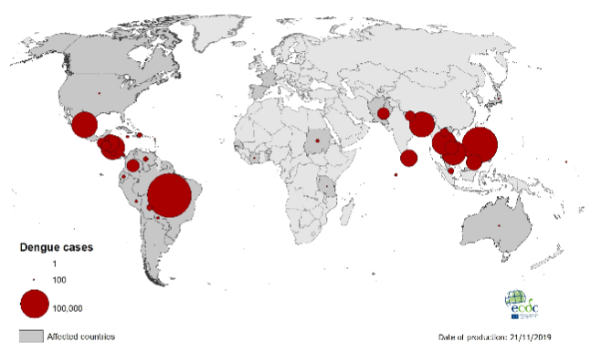 Στην Καμπότζη από τις αρχές του 2019 έως τις 7 Νοεμβρίου 2019 αναφέρθηκαν 62938 κρούσματα δάγκειου πυρετού.