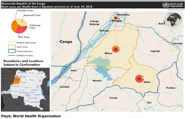 Σε εξέλιξη βρίσκεται επιδημία αιμορραγικού πυρετού Ebola (EVD) στη Λαϊκή Δημοκρατία του Κονγκό. Στις 8 Μαΐου 2018, το Υπουργείο Υγείας της Λαϊκής Δημοκρατίας του Κονγκό ανέφερε στον ΠΟΥ την επιδημία αιμορραγικό πυρετό Ebola στην υγειονομική ζώνη Bikoro, στην επαρχία Equateur. Η επιδημία έως και τη 10η Ιουνίου 2018 (Πίνακας) εντοπίζεται σε τρεις υγειονομικές ζώνες: Iboko (24 επιβεβαιωμένα, 3 πιθανά και 2 ύποπτα κρούσματα, και 7 θάνατοι), Bikoro (10 επιβεβαιωμένα και 11 πιθανά κρούσματα, 1 ύποπτο κρούσμα και 18 θάνατοι) και Wangata (4 επιβεβαιωμένα κρούσματα και 3 θάνατοι).