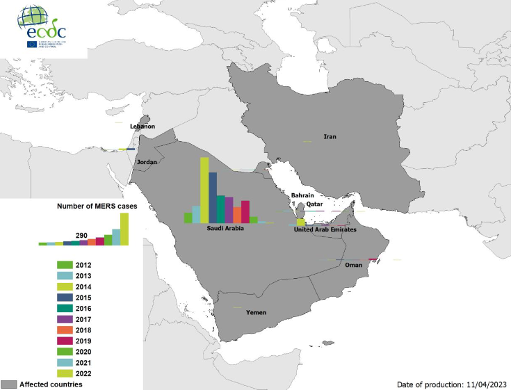 Γεωγραφική κατανομή επιβεβαιωμένων κρουσμάτων MERS-CoV, από Απρίλιο 2012 – Μάρτιο 2023