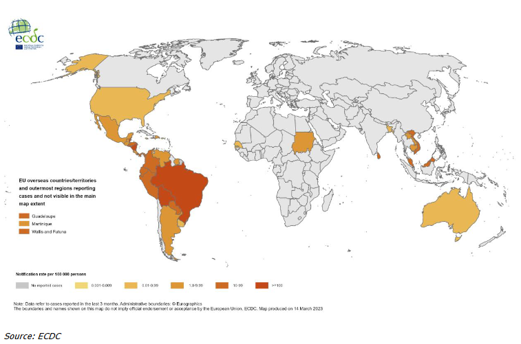 Γεωγραφική κατανομή κρουσμάτων πυρετού Chikungunya, Ιανουάριος - Μάρτιος 2023