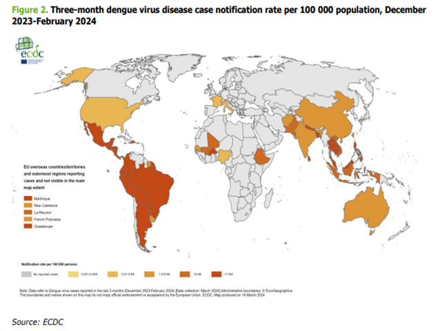 Από τις αρχές Ιανουάριου του 2024, περισσότερα από 5 εκατομμύρια κρούσματα δάγκειου πυρετού και περισσότεροι από 2000 σχετιζόμενοι θάνατοι αναφέρθηκαν σε 69 χώρες παγκοσμίως.