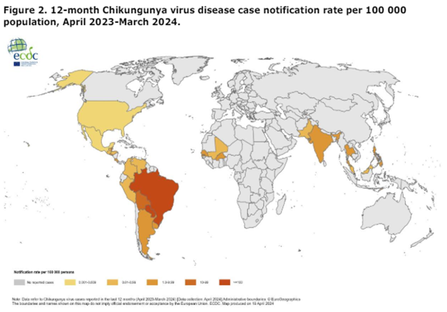 Το 2024 έως τις 31 Μαρτίου , έχουν αναφερθεί πάνω από 160.000 κρούσματα CHIKVD και περισσότεροι από 50 σχετιζόμενοι θάνατοι σε παγκόσμιο επίπεδο. Συνολικά δεκαεφτά χώρες ανέφεραν κρούσματα CHIKVD από την Αμερική (11), την Ασία (5) και την Αφρική(1). Οι χώρες που αναφέρουν τον υψηλότερο αριθμό κρουσμάτων είναι η Βραζιλία (161.794), η Παραγουάη(5.105), η Αργεντινή(272) και η Βολιβία(182).